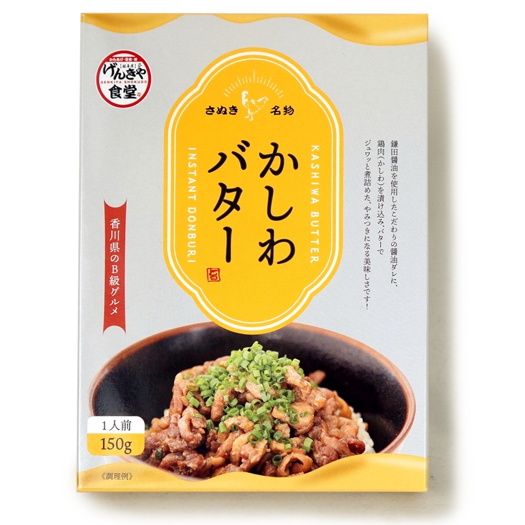 こだわりの醤油ダレに鶏肉(かしわ)を漬け込み、バターでジュワッと煮詰めた、病みつきになる美味しさのかしわバター。レトルトだから温めたらそのままお皿へ!ご飯にもお酒にもあう話題の香川県B級グルメです。長期保存も可能なので、常備菜としても便利です // ガッツリ スタミナ 丼 国産 鶏肉 お土産