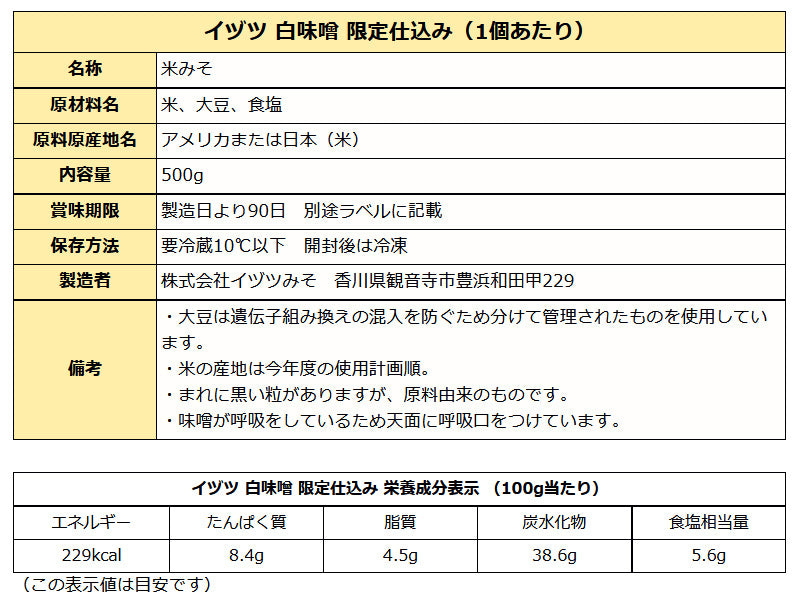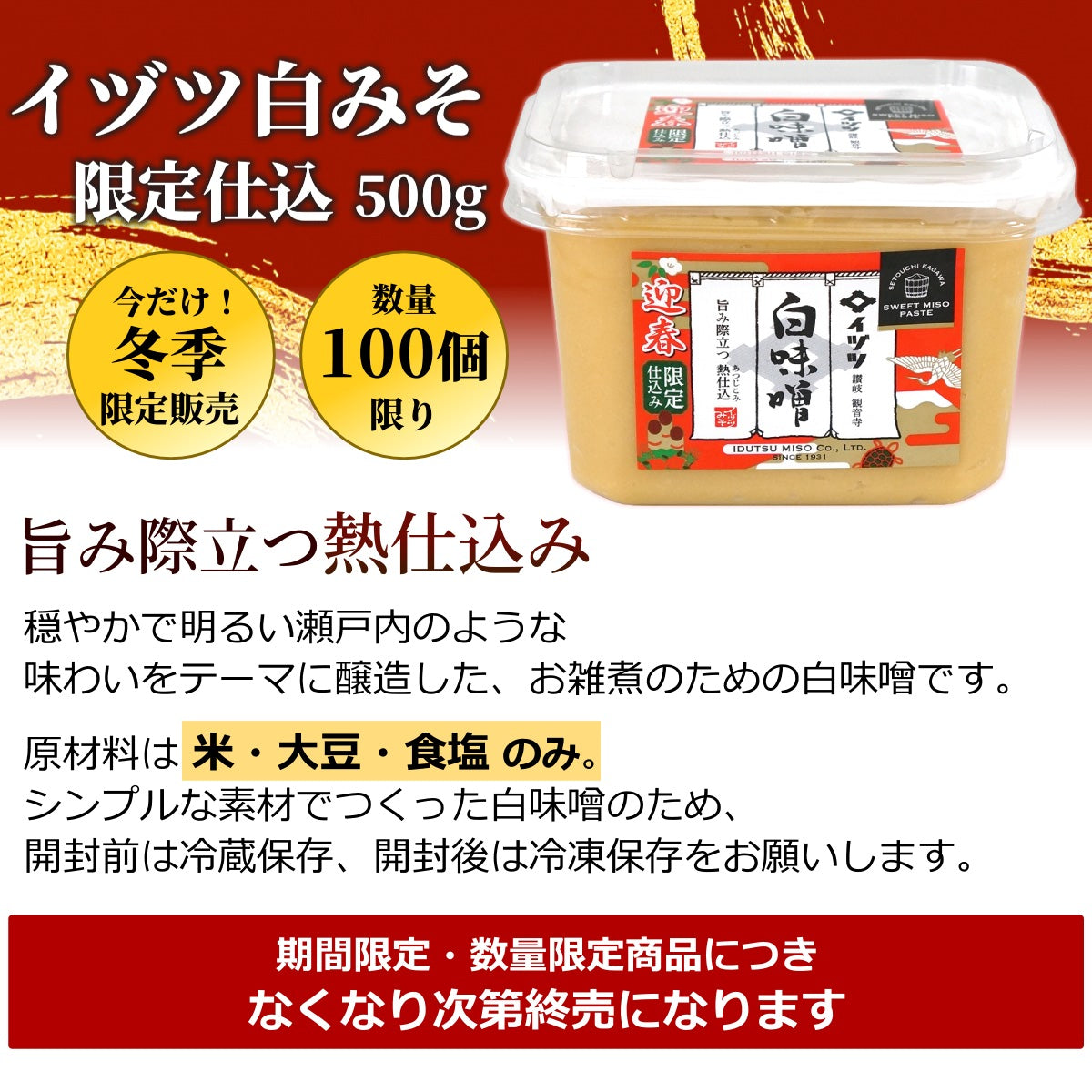 米、大豆、食塩だけで作った、お雑煮のための白味噌です。明るく穏やかな瀬戸内の情景を感じられる味わいをテーマに醸造しました。シンプルな素材の白味噌のため開封前は冷蔵保存、開封後は冷凍保存をお願いします。